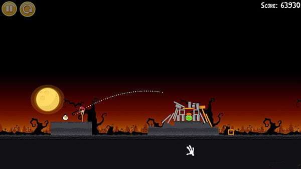 1-6:第一只鸟朝图中轨迹位置,击中左下角,干掉一个南瓜头,第二只鸟同样以一定角度斜插南瓜位置,(三星绝对拼人品,重复尝试了70多篇啊,苦逼有木有啊)