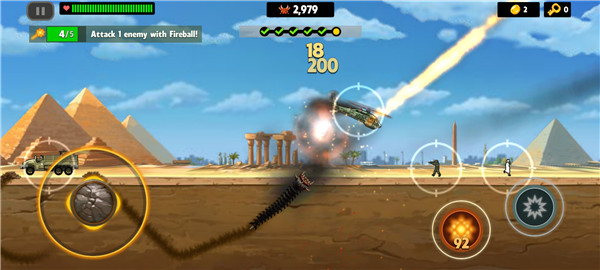 1、炸毁汽车和坦克;降下飞机和直升机,甚至是外星飞碟!战斗并摧毁40多种类型的敌人;