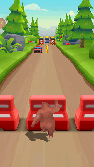1、操作熊大要灵活的躲避各种机关的攻击,游戏内跑道的构造都是非常复杂,跟动漫内森林都是非常的相似;2、玩家可以自己选择不同的熊或其的动物进行跑酷,但是前提是需要先解锁,游戏内的玩法也是相当刺激;