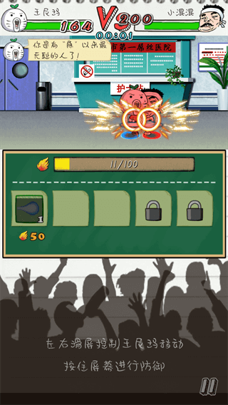 在里面技巧是左右滑动王尼玛移动,按住屏幕是防御,下方是你的技能,技能越好敌人受伤就越大,特别注意点击技能,一定要关键时刻来点击。