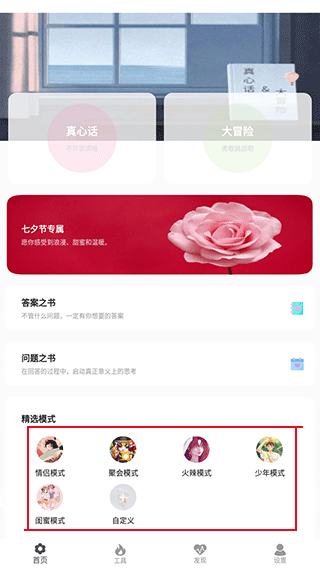 1、真心话大冒险:情侣、聚会、火辣、少年闺蜜等多种模式。