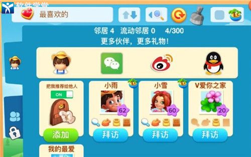 通过添加好友,成为邻居后,互相可以给对方的农场施肥、浇水,帮助邻居收获农作物,甚至是临时借用邻居的宠物。当然,农场的建设或经营遇到困难时,也可以请求邻居帮忙来支援