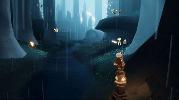 通过暴风眼的途中,狂风裹挟着巨石直面吹来,旅人们在艰难前行的同时需躲避头顶盘旋的冥龙。在远处最亮的星光指引下,旅人们抵达一处狭长窄小的隧道,两侧的石像灯台与散落在地的光之翼,仿佛预示着尽头一端的极度危险。
