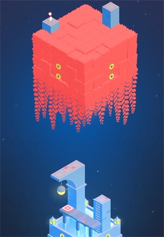 此时来到新场景中,玩家可以直接去点击发光小人,靠近它,进入下一场景。移动黄色建筑,走到黄色建筑上方的棕色方块,再将黄色建筑移动横截面,点击黄色按钮,最后移动一次建筑,让小人可以来到图腾处,本章节就到此为止啦!