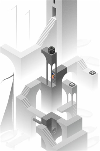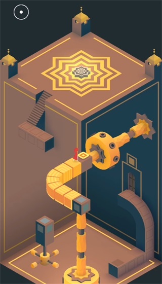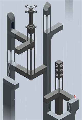 场景三先将建筑转成下图这个样子,接着进入传送门,小人会从中间一层的门出来,再次旋转建筑,组成楼梯,使小人可以向上攀登,最后三次旋转可以带领小人进入最终的门啦!场景四中的凸弧形墙与凹弧形墙都是可移动的,先利用凸墙移动到前侧灰色按钮处,再到另一个按钮处,图腾出现,本章完结。