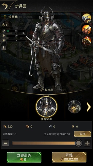 解锁高级的士兵需要提前解锁兵营,因此在成长阶段,领主就可以计划好自己需要训练的兵种和等级。在训练部队时,领主可以着重训练步兵,发生战斗时先消耗的是步兵,当一方没有了步兵就失去了前排,没有前排的保护,其他的士兵就会被攻击。