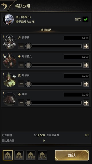 3. 输出兵种:剩余的出征量可全部带输出兵种,此时的输出兵种选择应该根据自身的buff做调整,比如你的弓兵攻击属性很高,则应该选择最高级的弓兵作为主要的输出兵种,其他输出兵种可携带小部分作为辅助输出;如果是长枪兵的buff很高,则同理主要携带长枪兵,其他输出兵种辅助输出;