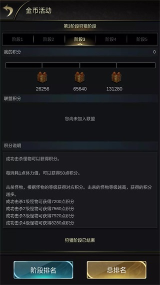 狩猎阶段周三开启。怪物和营地分30个等级,击败不同的等级怪物会获得不同积分,领主可以根据自身的实力去攻击适合等级的怪物或营地。怪物等级越高,从怪物身上掉落的道具就越多。在这个阶段可能有领主会遇到体力不足的情况,因此为了在第三个阶段中拿到较好的名次,我们需要提前备好体力值,集中放在周三使用。在攻击怪物时,领主可以同时派出几支队列,以此更节省时间。