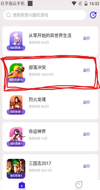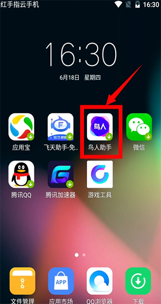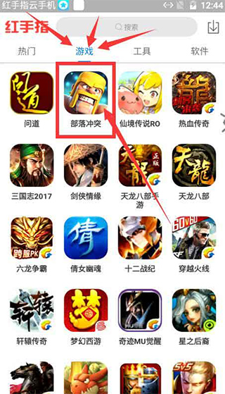 第三步:设备启动好之后,在红手指设备里记住是红手指设备里,不是手机里。下载两个软件【部落冲突】和【鸟人助手】