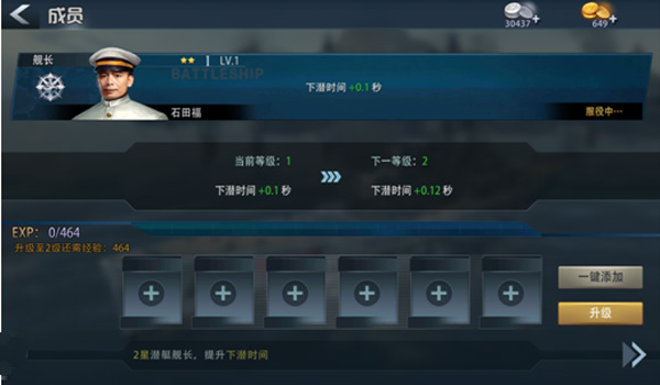 5、潜艇:强在隐匿和多鱼雷,弱在机动,如果想要进一步提升隐匿能力和鱼雷,可以对成员中的“舰长”“火炮手”来选择提升,如果想要弥补短板,那么可以对成员中的“轮机长”来进行提升,如果想要进一步提升辅助探测,可以对“通讯员”来进行提升。