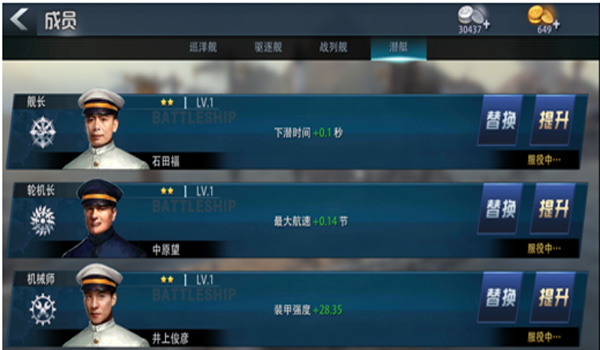 4、驱逐舰:强在机动,探测,弱在防御,如果想要进一步的提升机动能力,可以对成员中的“轮机长”“通讯员”来选择提升,如果想要弥补短板,提升防御能力,那么可以对成员中的“机械师”来进行提升。