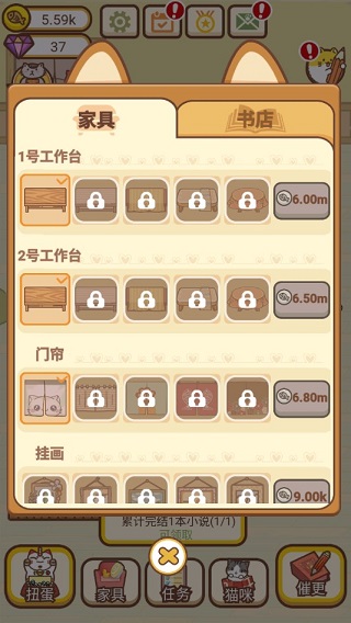 这里就是您的工作室了,现在还空荡荡的呢,没有桌子猫咪们根本没有办法工作呢,现在开始,先添置一张桌子,然后招聘作家开始写作吧!