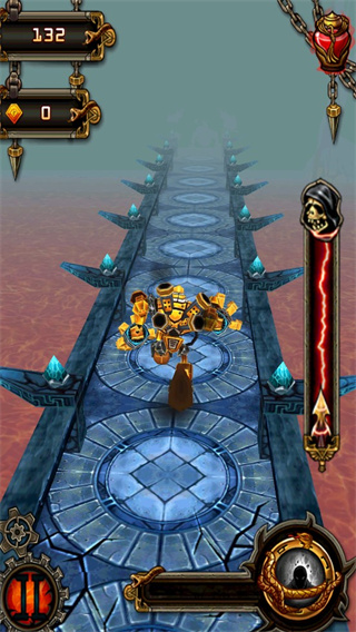 1、翻过古庙围墙,爬上悬崖峭壁,测测你的反应力;2、挥击转弯、跳跃、滑动躲过障碍物,收集硬币,购买能量,看看你能跑多远!