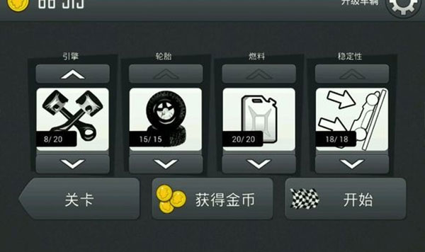 在部件系统里,可以对汽车增加一些新的部件,增加汽车的性能。在新手阶段,我比较推荐带重型、磁石、着陆助推力三种部件。重型,可以增加赛车的重量,降低赛车的重心,使赛车在行驶时能够更加的平稳。磁石,可以收集燃料和半径更宽的金币,可以更快的积累足够的金币来对赛车进行改造升级。着陆助推器,可以在赛车跳跃落地以后,获得一段冲刺,拉开与其他赛车的距离,获得更高的评价。