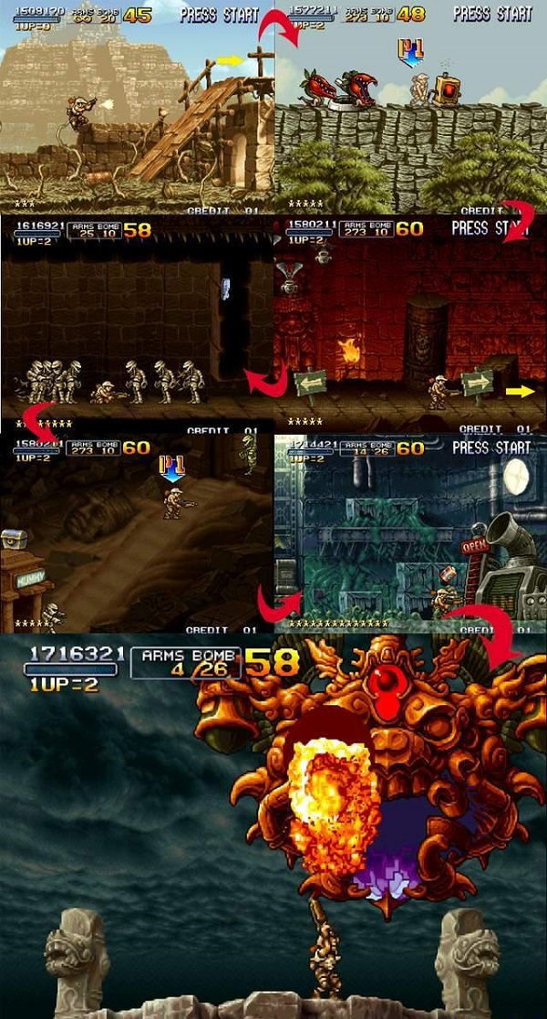 不知道大家注意到没有,其实在《合金弹头1》和《合金弹头2》中就已经有了隐藏的路线,只是不是那么明显,不会场景切换。