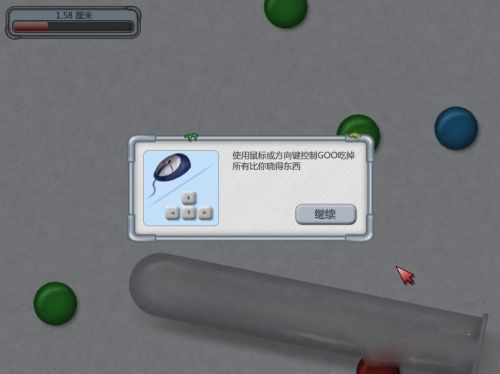 3、新手教程:进入游戏之后,一开始游戏会给你相关的提示,如用游戏鼠标移动我们的这个怪物,吃掉箭头指示的比你小的食物等等,根据新手教程来开始游戏吧,来感受一下这个怪物的世界。