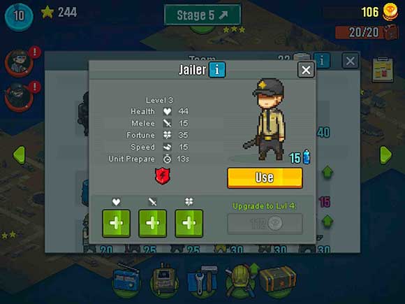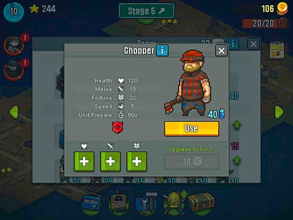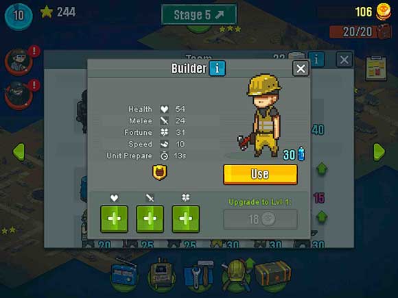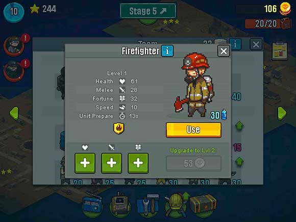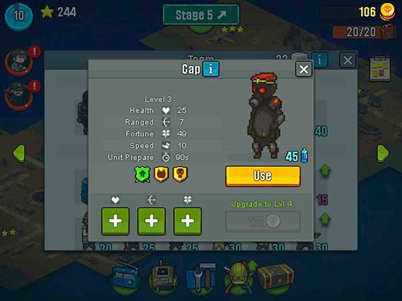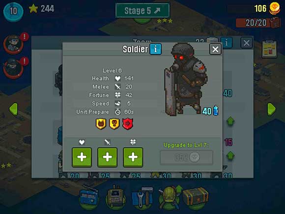 卡车的升级只需要金币,但是士兵的升级更为复杂一些,血量、攻击力和幸运值的升级需要各自获得相应的补给才能升级。