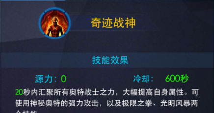 5、“奇迹战神”技能,变身为神秘四奥之一的赛迦奥特曼持续20秒,自身的属性会有大幅度的提高。