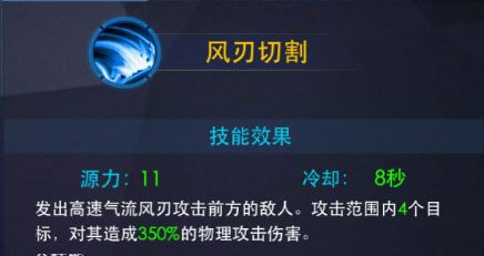 7、“风刃切割”,发出高速气流攻击敌人,小型aoe伤害,可以对4个目标造成伤害。
