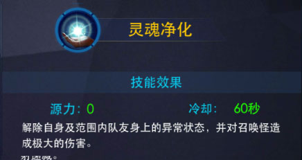 13、“灵魂净化”技能效果是解除自身及队友身上异常状态,并且对召唤怪造成伤害,这不禁让我想到光辉赛罗的样子。