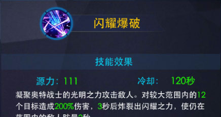 16、赛罗还有一个终极技能“闪耀爆破”,凝聚奥特战士的光明之力攻击敌人,对12名敌人造成巨额伤害并且眩晕。果然赛罗的潜力是无限的。