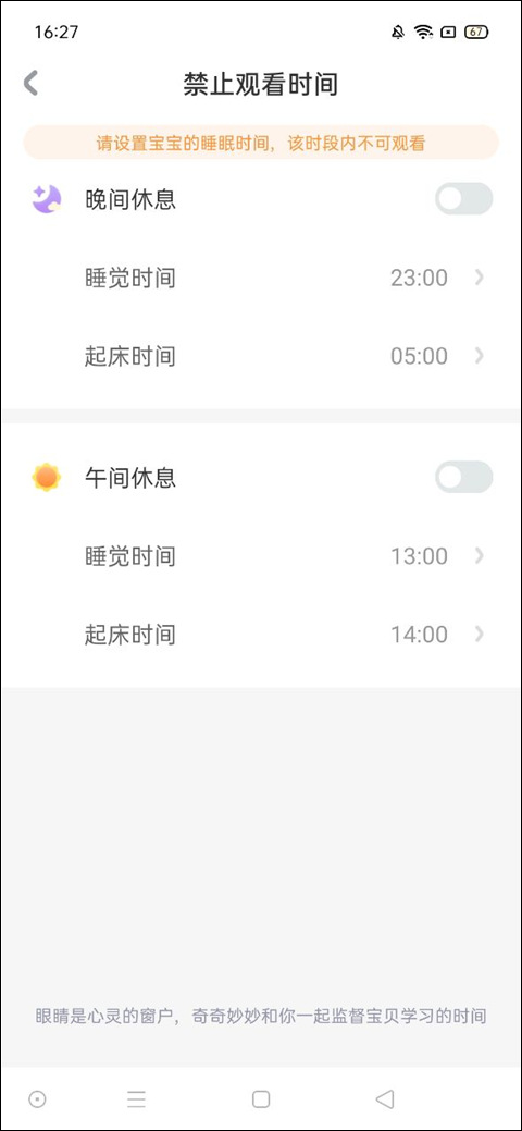 5、进入禁止观看时间界面后,可以设置晚间休息时间和午间休息时间,勾选之后,选择时间段。