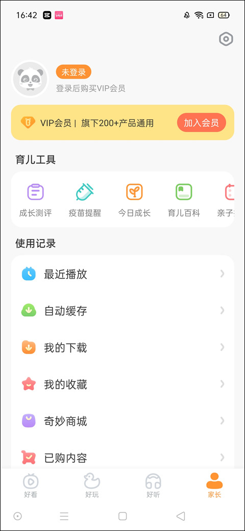5、点击家长,可以登录app,查看播放,缓存记录。