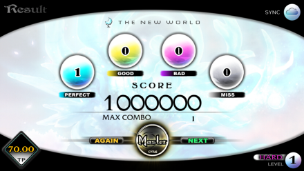 当完成一首曲目的游玩时,便会出现结算画面。游戏结算分为五种,分别为总分(Score)、技术反馈、评价(Grade)、技术得分(TP)和最大连击数(Max Combo)
