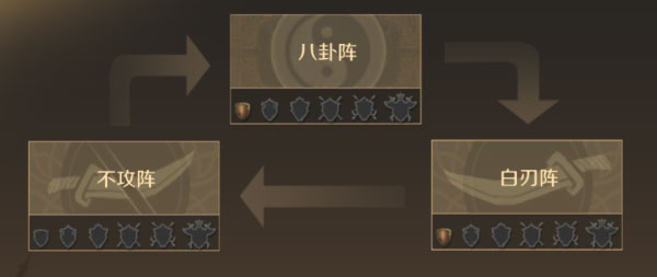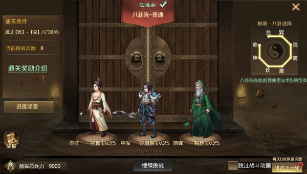 每个阵法有6个难度,通关一个难度后则按顺序开启下一个难度。每个难度通关后可获得一个对应的奖章,集齐三个相同奖章即可兑换银币奖励。