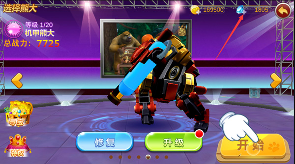 1、开局熊大行驶卡车,熊二则是持驾飞机,别瞧这仅是平民装,合体后战力不容小窥,开始前修复一下。2、点选关卡后,将主目标视为整局的战斗目的,另外时间把控好,在拯救小动物时不可多费时,然后“开始”。