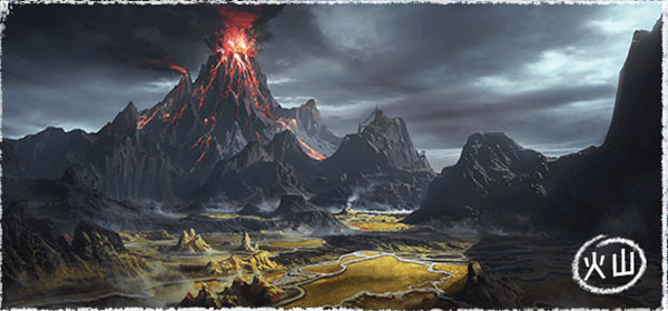 远处的天空都被映照成了暗红色,那是一座巨大的活火山。赤红色的岩浆不停地喷涌而出,所经的一切都会被点燃、融化,归于灰烬,彰显着原始而蛮荒的巨大力量。每一次呼吸,你都会感觉自己的内脏已经被灼伤。炽热的空气将周围的一切图像都扭曲了。枯萎焦黑的树木像一只只垂死呼救的干瘪人手,抓向天空。就连坚固的岩石也被炙烤得裂开了一条条缝隙,只要一碰,就会变得粉碎。那些干枯的河床中,流淌的只有硫磺和火焰。但求生的强烈欲望告诉你不能后退,想要逃离这座地狱一样的荒岛就只有两个选择,死或是继续前进。