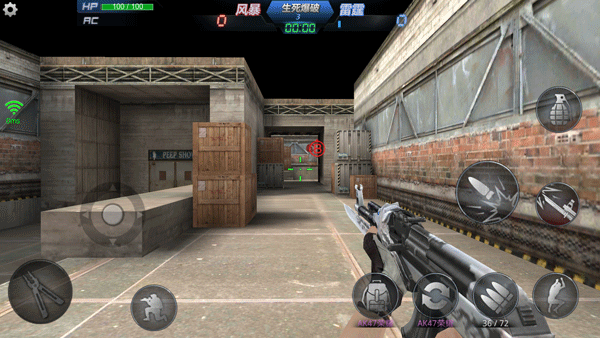 游戏画面左下角有一个圆圈状的虚拟按钮,右下角有个未显示的虚拟按钮,玩家通过滑动虚拟按钮控制人物的动作。其中左下角的虚拟按钮控制移动右下角的虚拟按 钮控制准星和射击。同时,在画面左上角设置按钮中有战绩查询、游戏设置、键位设置功能,左下角有蹲下按钮,画面右侧分布有跳跃、切换武器、换子弹、扔手雷 等按钮。