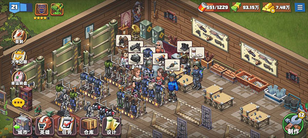 装备:可用来卖钱,提升英雄力量,装备的制作需要有员工、材料、图纸。
