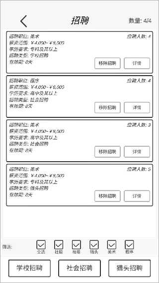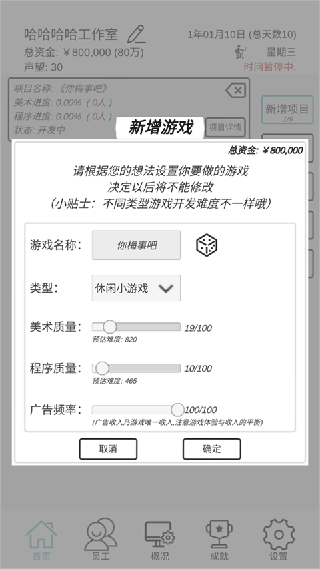 2、先新增添新项目,最好是休闲小游戏,再去招聘10个员工,最好招聘5个美术5个程序员工。
