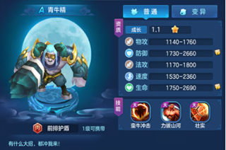 青牛精:新手前期必出的肉盾,技能能对前排的敌方进行嘲讽,有一定的控制能力,是新手过度的肉盾之一哦。