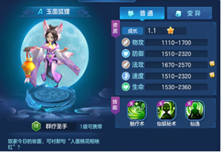 玉面狐狸:适合新手使用的单体奶妈之一,而且还能持续回奶,虽然她既不能复活也不能加buff,但是狐狸的奶量还是很足的~