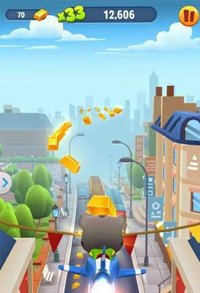1、【飞机】“飞机”或许是汤姆猫跑酷2里人气值最高的道具了。玩家拾取该道具后,可在一段时间内驾驶飞机翱翔天际,完全不必担心撞上障碍物;同时,飞行路线上还会出现大量金条,只要操作得当,这段“上天”时间就能让你赚得盆满钵满。需要注意的是,飞机的飞行速度比玩家在地面跑酷的速度快很多,如果手速不够快,便可能错过捞金的大好时机。因此,想要成为合格的飞行员,小伙伴们就得努力提升自己的变道技术。