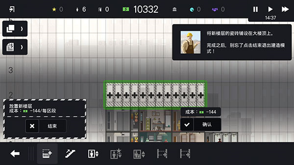 10、完成后点击图示处,按住屏幕向右滑动,选择放置的区域,为摩天大楼新建楼层吧。