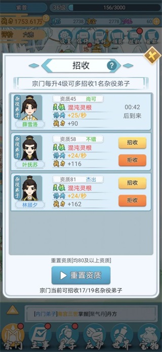 招人:弟子面板分四个:资质,灵根,修为,战力。招人首先看灵根,其次看资质,修为的增长有3方面相加:资质,灵根,修为。