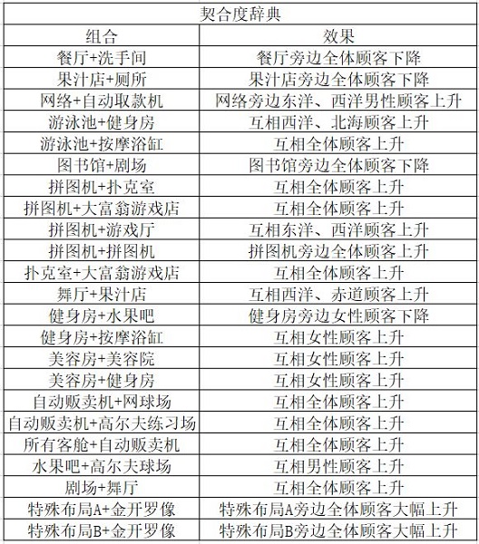 建议开局就在餐厅周围放满加魅力的植物,只留一个入口,超市也是必要的。在自动贩卖机旁边放小船室,厕所每次都会加满足,一定要有,不过绝对不要把厕所紧埃着任何建筑,否则魅力会降低。