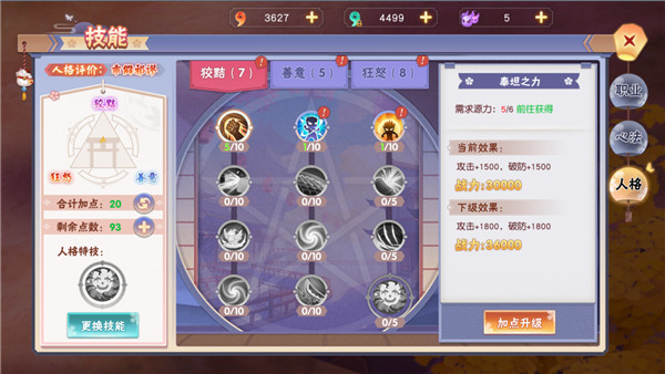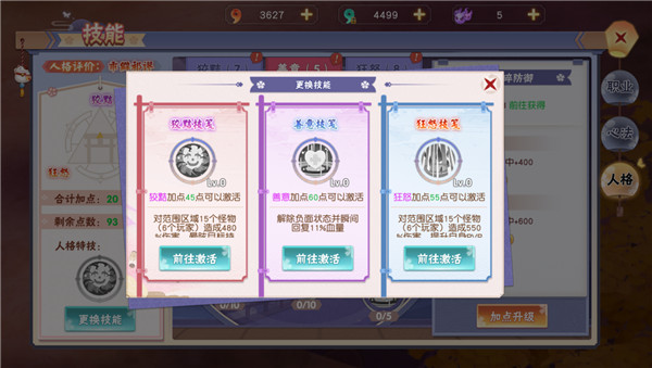 要开启人格系统首先需要达到天命5级,承袭天命,才能设定独特的人格。人格技能分为三个分支:狡黠、善意、狂怒,每一个分支的侧重点都不一样,同时三个分支加点到一定的点数还能获得一个终极大招。