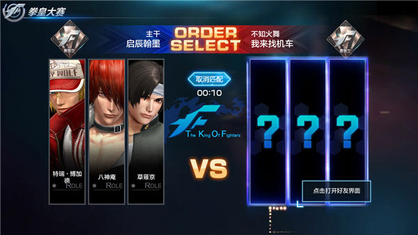 拳皇大赛采用经典的拳皇3VS3赛制,可以使用3名格斗家依次进行比赛。在拳皇大赛中,胜场越多,越接近晋级赛;负场越多,越接近降级赛,也就是说,胜利会使胜点增加,失败会使胜点下降。胜点满时,处罚晋级赛,胜点为零时,触发降级赛。