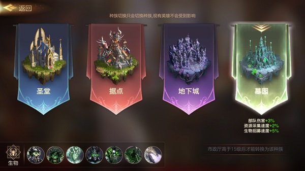目前亚山大陆上共有圣堂、地下城、据点、墓园四支,每个种族下又有特色兵种各七支,确实是一道不简单的选择题。