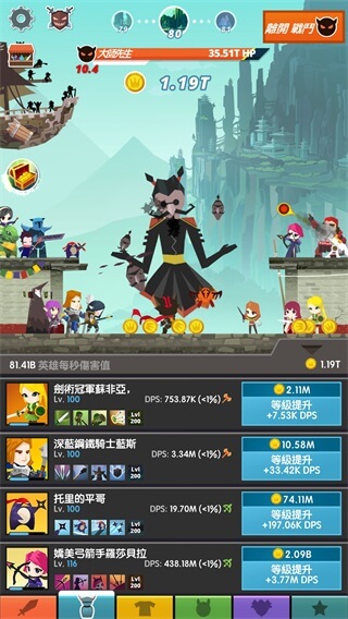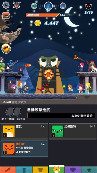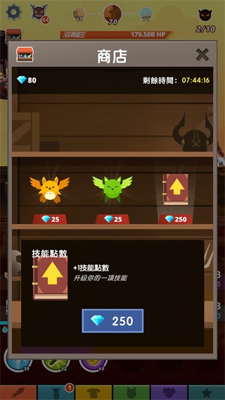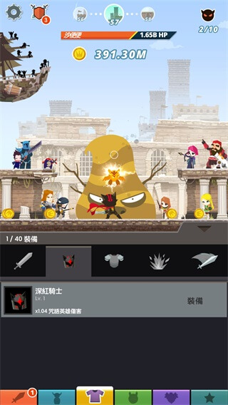 除此之外,进入游戏玩一会就会发现底下的菜单栏从原来的4个变成了现在的6个,除了之前的主角栏、雇用英雄栏、神器栏和商店之外,这次还多了装备和宠物两栏,别小看这两个多出来的,这让游戏的成长系统多了两个也能让游戏变得更耐玩,装备可以改变主角的装扮也可以使自己变得更强大。宠物也是很强的,在游戏中你将获得多个宠物,在技能树里还特意有宠物的加点,宠物是隔一段时间会出现在哦,游戏中,有主动技能和被动技能,可以升级,算是半个英雄了。