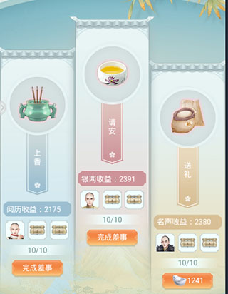 5、再有可办差次数的时候,先把所有委派的伙伴卸下,再把心机属性最高的伙伴委派到阅历办差上进行阅历收益;完成阅历收益后再次卸下伙伴,把才华属性最高的伙伴委派到银两办差上进行银两收益;完成银两收益后最后再卸下一次伙伴,把姿色最高的伙伴委派到名声办差上进行名声收益。