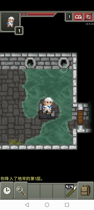 点击图标进入游戏,选择职业进入地牢就到了游戏界面。1.头像:左上方框中为头像,头像框右下数字为等级,右方长条条是血条。头像黄色闪烁提示有未使用的天赋点。头像呈红色闪烁提示血量低该考虑回血了(露珠、回春草、治疗药剂、催眠卷轴)。点击头像可查看当前属性、状态,选择天赋。状态也会在血条下面显示图标,包括各种增益、负面状态及剩余回合数。
