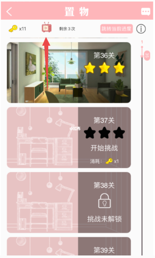 【设计挑战】每天固定三把钥匙(也可看广告额外取得),一把钥匙开始一个关卡,家具免费使用