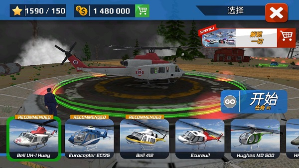 1、首先从本站下载并安装直升机飞行模拟器无限金币版,运行打开2、在进入游戏后,你可以选择不同的角色来完成本次的飞行任务!点击开始!