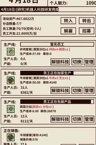 5.机器人科技。前期资金紧缺,在机器人大赛前点上一次就行,后边必须一直跟着点,赢了可以增加销量(注意分配生产人员和销售人员,一般产量要稍大于销量,这样机器人大赛后正好可以追回来,不用来回调整)一句话,怎么偷懒怎么来。