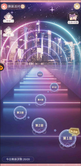 4、派对为时装比拼类型,根据每个关卡的要求穿戴相应类型额服饰即可增加分数,分数超过通关条件时即可通过,超出分数越多通关星级越高,最多3星。